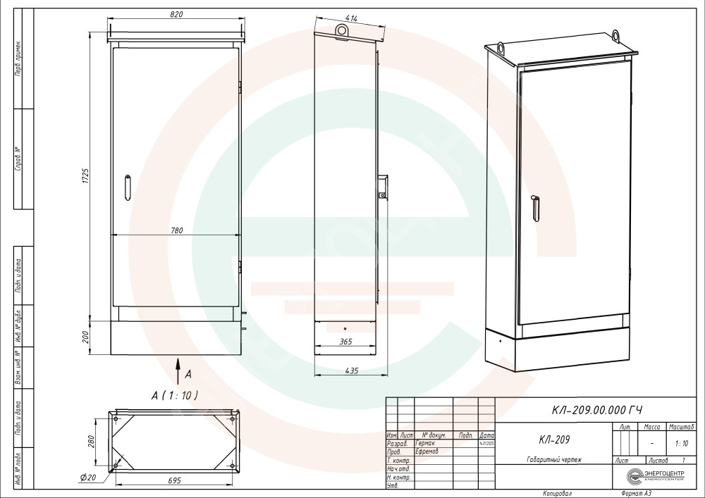 Кабельный киоск представляет собой металлический шкаф с наклонной крышей и козырьком для отвода осадков. Корпус КЛ-209 выполнен из листового металла толщиной 1,5 мм. Антикоррозийная защита шкафа выполнена порошковой полиуретановой краской (толщина покрытия – 220…250 мкм). Дверь оснащена проушиной под навесной замок. Имеются грузовые проушины для строповки шкафа при транспортировке и монтаже. Корпус шкафа может устанавливаться на цоколь.